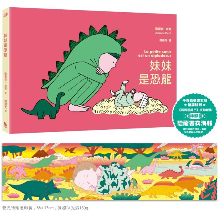 以螢光特別色印製,66x17cm,質感沐光紙150g。請打開書衣裡面,看看大恐龍與小恐龍吧。