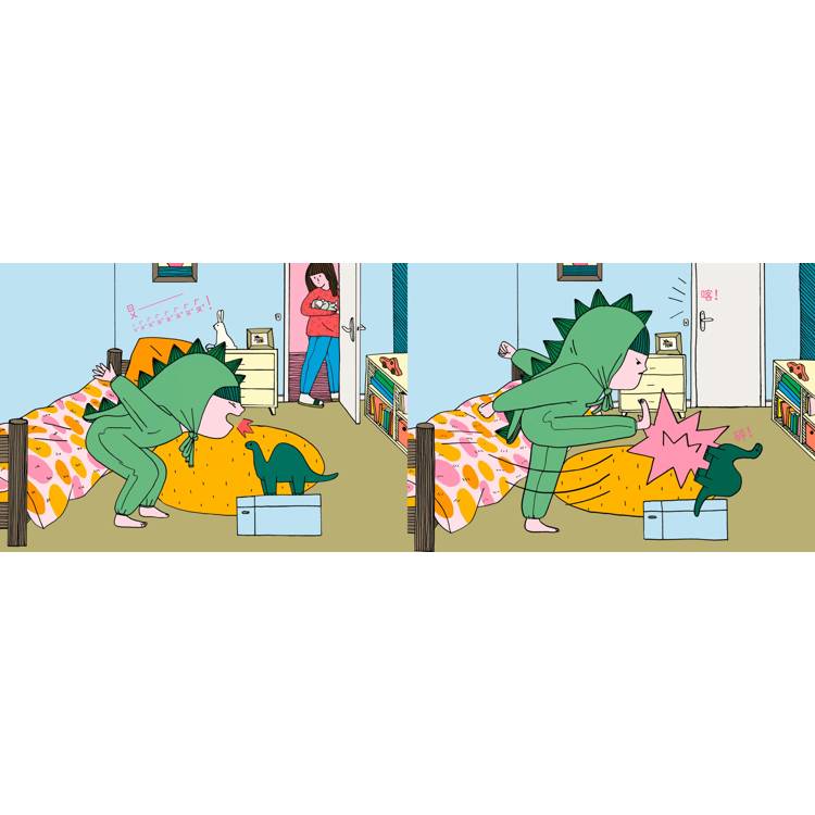 穿上恐龍衣的大哥哥,就像《野獸國》裡的阿奇,大叫、大鬧一場,用力的釋放自己的情緒,而本書示範了父母如何在這個兩頭燒的時刻,接住大寶的心情,並且帶來最深刻的同理和支持。 也因為這樣的過程,讓大寶得以漸漸找到自己與小寶寶互動的方式。