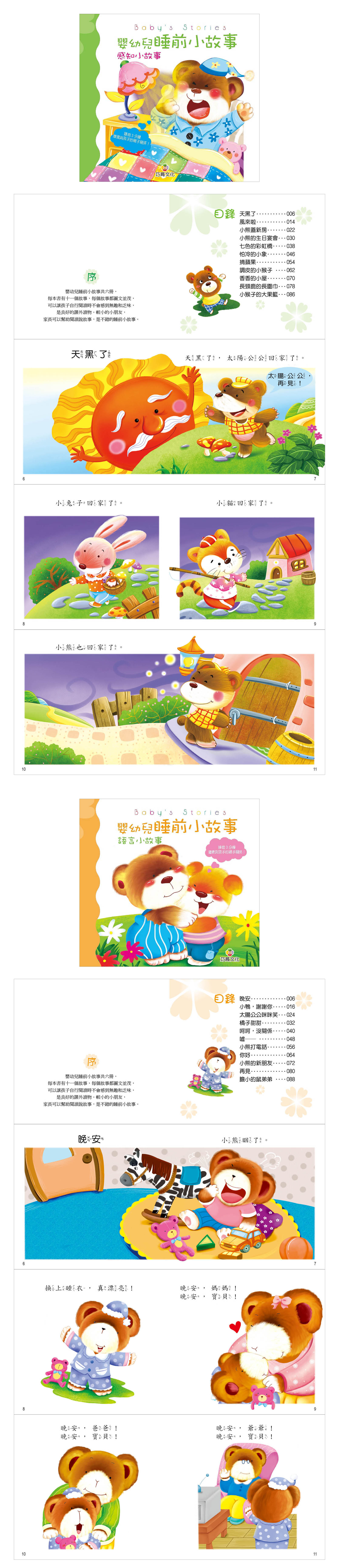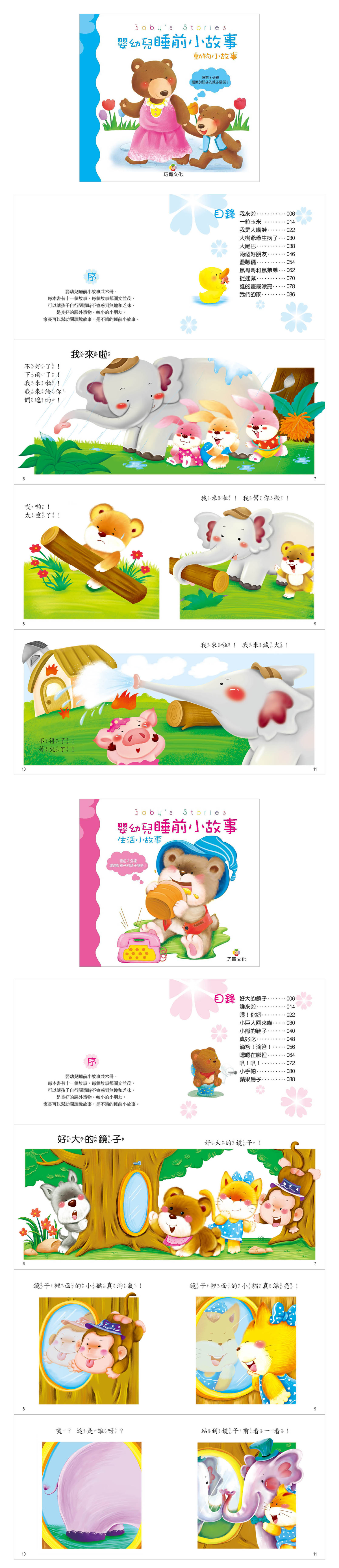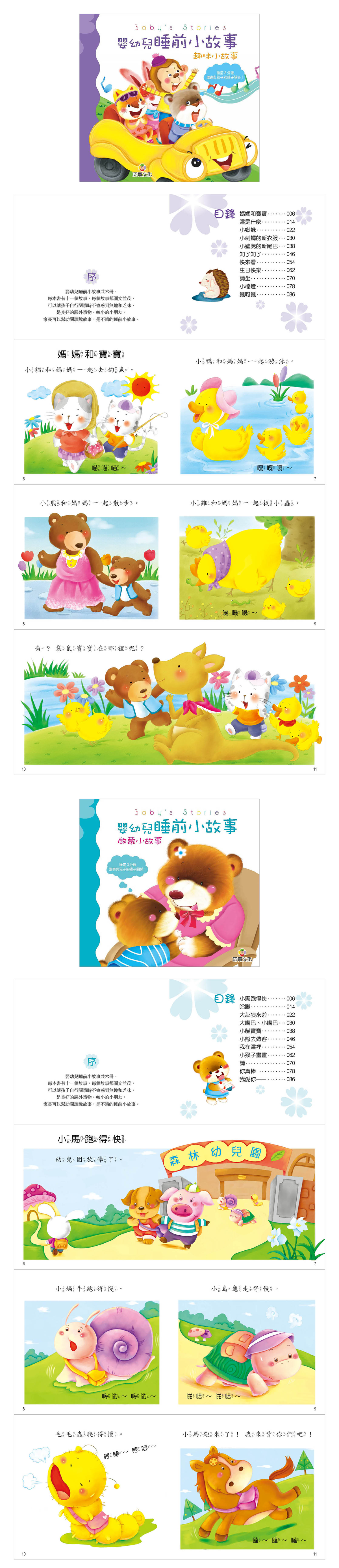 內容介紹: 嬰幼兒睡前小故事共六冊,每本書有十一個故事,每個故事都圖文並茂,可以讓孩子自行閱讀時不會感到無趣和乏味,是良好的課外讀物。對於較小的小朋友,家長可以邊讀邊說故事,是小朋友不錯的睡前讀物喔!