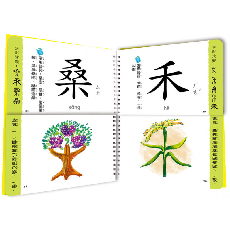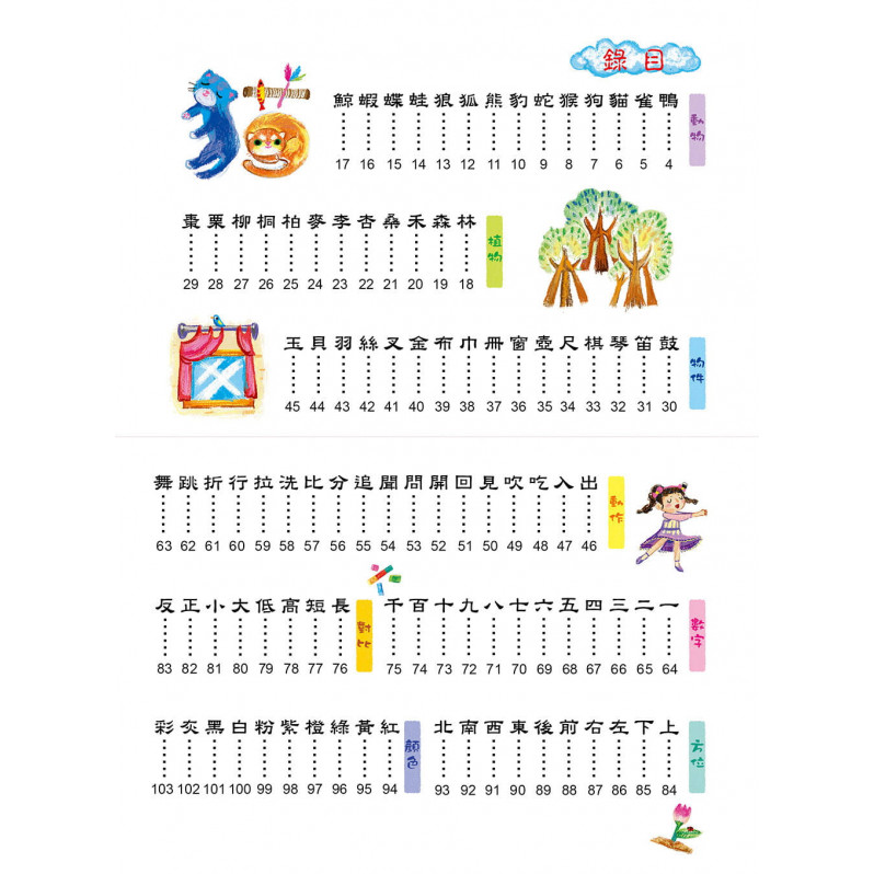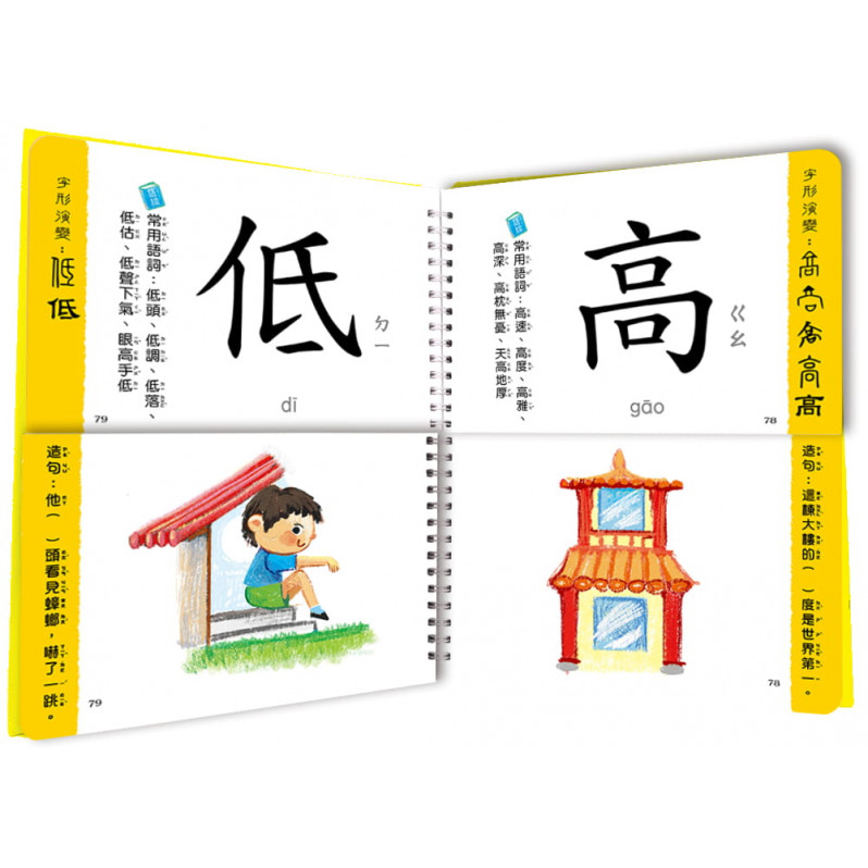 本書共有100個漢字,依「動物、植物、物件、動作、數字、對比、方位、顏色」來分類,讓孩子在認字同時,學習辨別漢字適合使用在何時、何處。每張圖片皆與對應的漢字相似,利用聯想記憶的方式,讓孩子認字,並學習唸法,反覆閱讀後,就能逐漸學會100個漢字了!