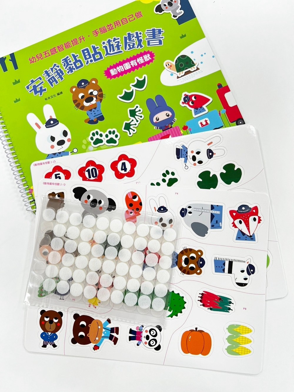 每本遊戲書都附有2張紙卡及60組魔鬼氈,紙卡上琳瑯滿目的圖案,都對應到書頁上畫有圓點的地方,不僅紙卡大塊設計好拿取,高品質魔鬼氈還可以重複撕貼,超級耐玩!