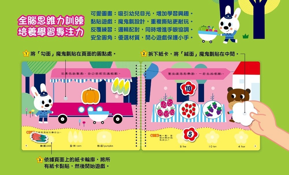 這是一套讓孩子練習專注的安靜書,也藉由豐富好玩的主題、簡單的配對遊戲,手腦並用訓練孩子的思維及邏輯能力,搭配厚紙魔鬼氈圖卡,貼心重複黏貼且耐玩的設計,讓孩子一玩再玩,愛不釋手!