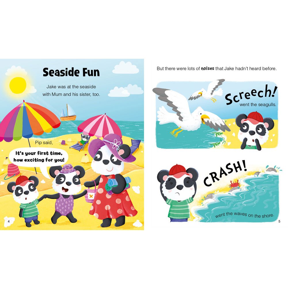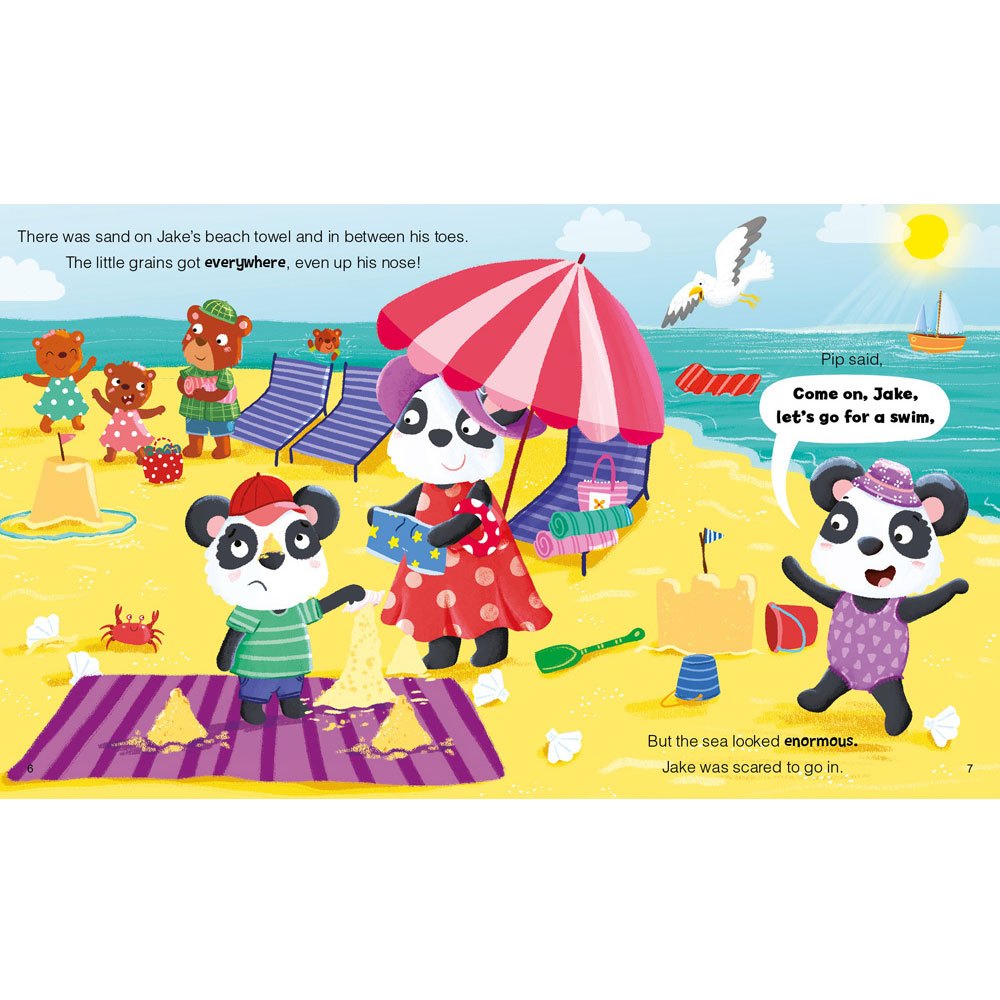 傑克第一次到海邊玩,心情非常興奮,姊姊拉著他一起去游泳,但是大海看起來太大了,傑克害怕不敢下水。打開書本看一看,之後發生什麼有趣的事呢?