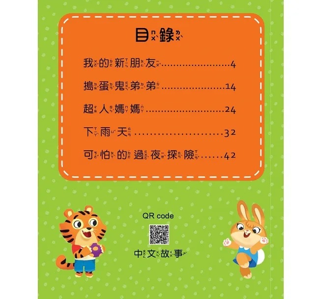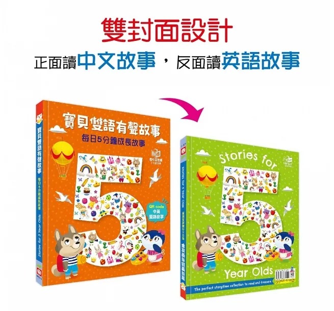 雙封面設計,從正面翻開讀中文故事,從背面翻開讀英語故事,培養孩子閱讀專注力。而聽音、辨音、仿音是所有語言學習的重要基礎,不論是母語或外語都可以從「語音啟發」開始,聆聽故事就是最好的方式,讓孩子奠定好的語感,自然而然引起學習興趣。