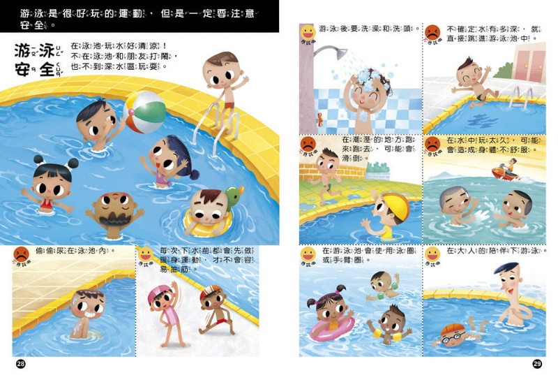 每日最常做的事情就是上學和在家了,在公共場合亂跑亂叫、不守規矩、鬧脾氣等行為,又是如何影響我們的安全呢?跟著一起好好了解安全的重要性,受傷危險都遠離!主題貼近孩子的生活,包含戶外安全及日常生活中會面臨到的問題,拓展孩子更廣闊的視野,符合低齡孩子的認知需求。