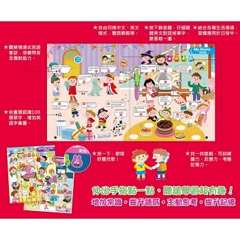 不用播放CD,不用點讀筆,只要用手指點一點,就能透過豐富場景及日常對話情境,輕鬆學習中、英文語詞及發音,操作簡單、使用容易,不管在哪都可遊戲及學習。搭配好玩的「錄音跟讀」功能,孩子跟著書本反覆練習英語聽、讀,既好玩又好記憶,自然而然學會所有英文單字及對話。