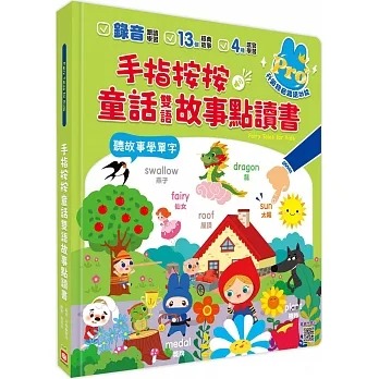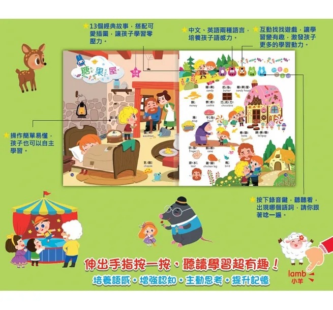 不用播放CD、不用點讀筆,體驗不同的情境式童話故事聽覺饗宴,搭配故事情節在互動問答遊戲中輕鬆學習中英單詞,只要用手指點一點,就能學到超過200個語詞,讓學習語言輕鬆成為生活的一部分!
