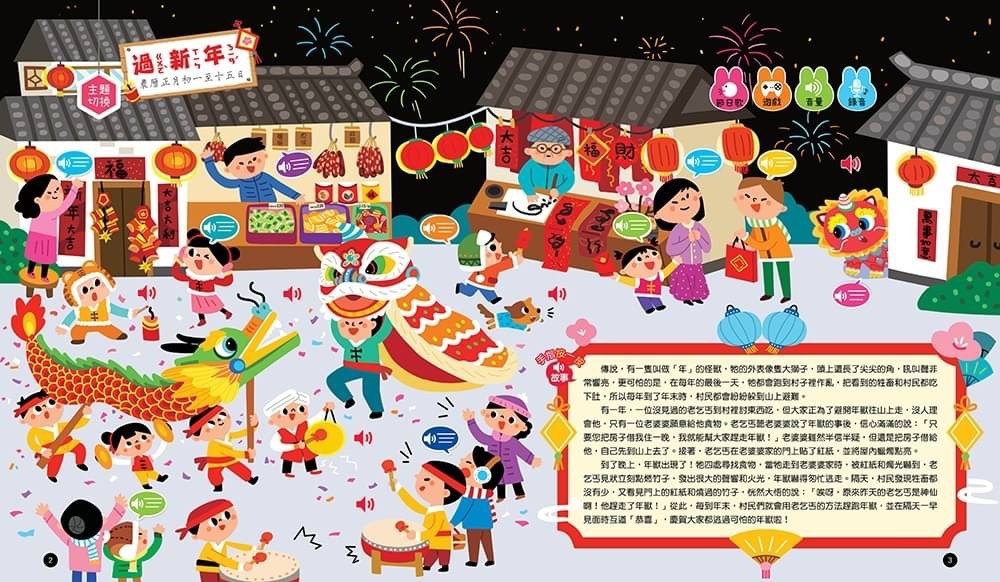 在各個節日場景中添加大自然、動物叫聲、身體反應、動作等各種音效,除了讓畫面更生動,閱讀更有趣外,還能讓孩子更有想像力,並透過聽覺訓練孩子的專注力、記憶力和辨別能力。