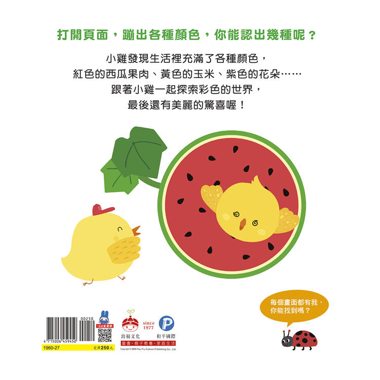 「綠綠的西瓜裡藏著紅色果肉,小雞的毛和玉米一樣是黃色的……認識顏色真有趣!」