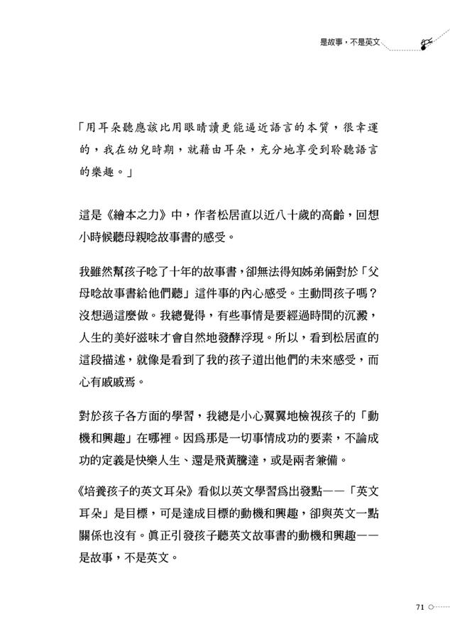 她不喜歡唸中文故事書時,穿插英文在裡面,她覺得這沒意思。
