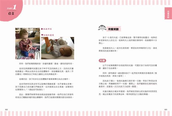 ●主題豐富多樣,含房間布置、遊戲區規畫、日常生活活動、物品的選擇、數學/語言學習法,方便家長依孩子的成長找到適合的主題。