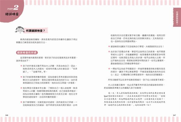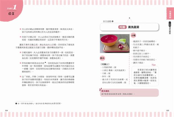 ●提供圖解具體參考,圖解各式蒙特梭利教具與遊戲方法,並附有小提醒及進階加強建議,易理解及方便依步驟執行,自製教具也ok!