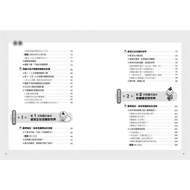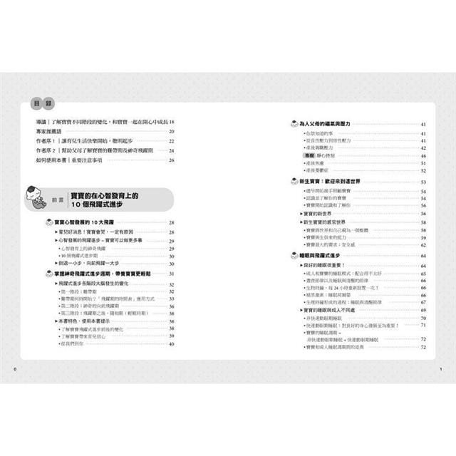 ➢ 心智發展上的飛躍式進步=寶寶可以做更多事:附飛躍期的時間表,揭示10大難帶養階段及心智發育的10個飛躍式進步期,讓父母了解飛躍如何幫助寶寶理解世界並如何發展出適應世界的新技能。