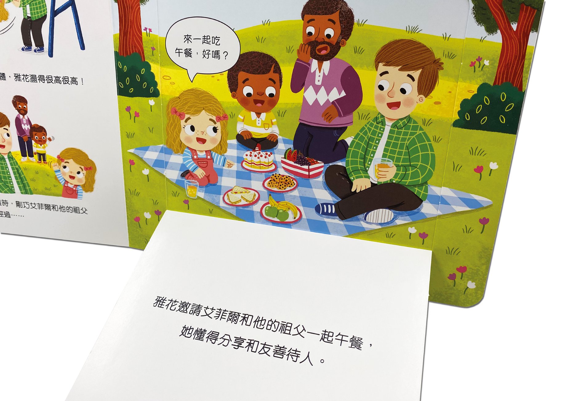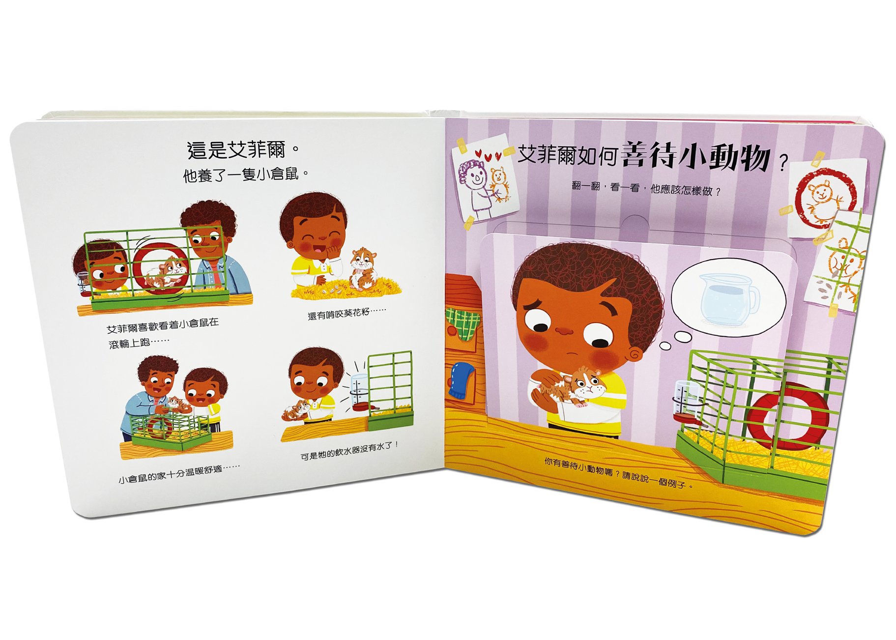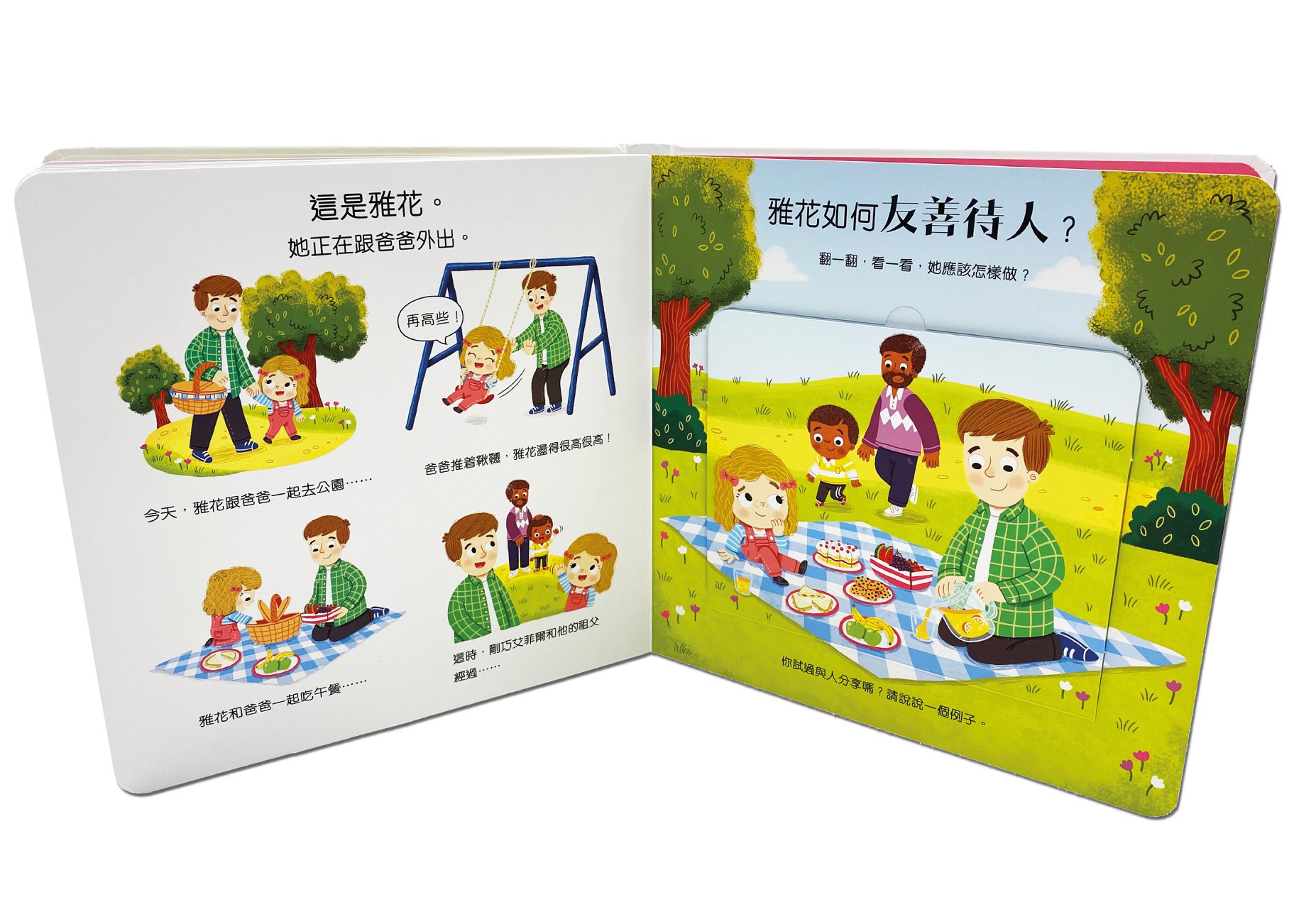 內容介紹: * 8 個翻翻頁,培育幼兒的良好品格! * 培養幼兒的同理心,促進社交能力, * 教導幼兒待人接物的正確態度! 學習正確地待人接物, 是建立個人品德和社交能力的基礎。 本書透過 8 位小朋友的生活經驗,讓幼兒翻一翻不同的情境,學習待人接物, 並明白到凡事體諒、友善待人的重要。 幼兒能從本書的翻翻頁,學習以下8種社交能力: • 學習禮讓 • 善待家人 • 互相幫助 • 主動結識新朋友 • 培養同理心 • 善待小動物 • 善待長輩 • 懂得分享