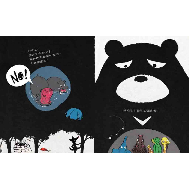 「叩叩叩!我可以進來嗎?」黑熊想加入被拒絕的動物們。