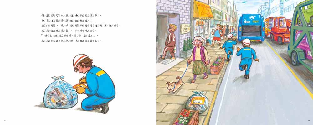 工作人員做完伸展操,就開著垃圾車沿著街道,把一袋袋的垃圾放進垃圾車的車廂裡,收完商店街的垃圾後,再收家用垃圾,大樓的垃圾是放在一個收集區裡。