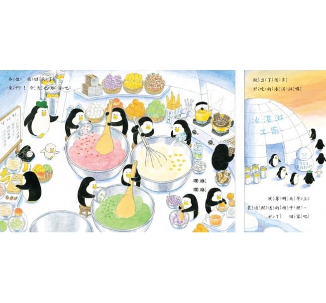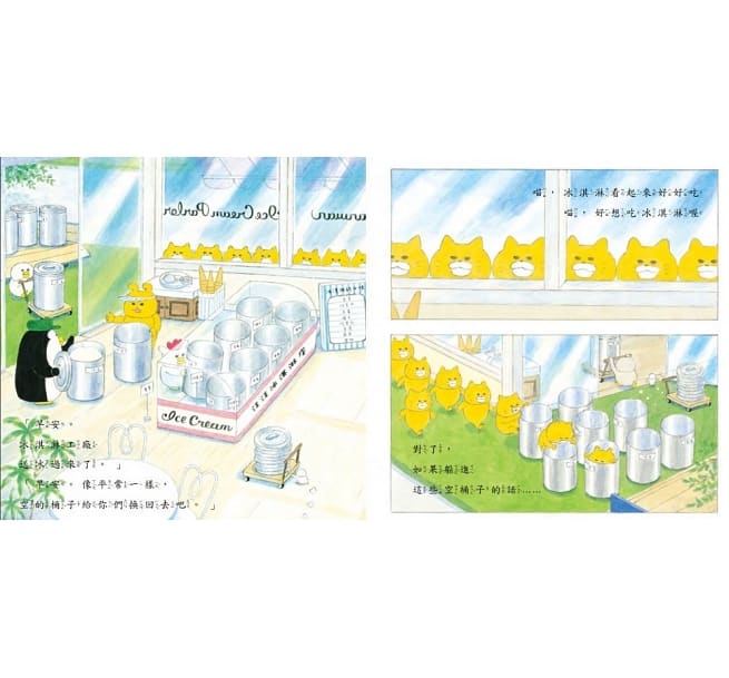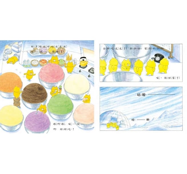 牠們偷偷躲進空空的冰桶裡,來到冰淇淋工廠,把整個工廠的冰淇淋吃光光,離開時風雪交加,冷得野貓們變成了野貓雪糕。