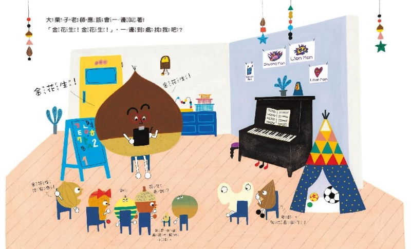 眾多和堅果相關的有趣人物,都在其中扮演著不同的角色,從開頭的大栗子老師、認真的核桃警察、看到警察來找花生而緊張不已的偷豆賊、到處炫耀的松子朋友,以及拚命尋找花生的魷魚(據說韓國有種很受歡迎的零食叫「魷魚花生」)……每個場景都相當帶有幽默感,帶有特色的堅果人物們,大大增加了整本書的閱讀樂趣,經過許多媽媽實際測試,在畫面中找到隱藏在各處的角色,是孩子最喜歡做的事!