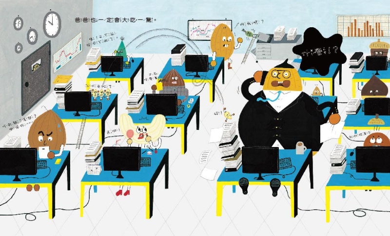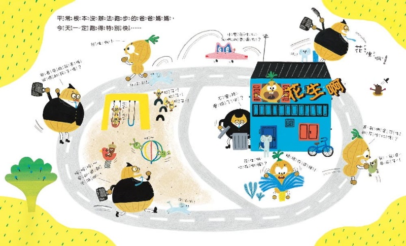 不只情節充滿童趣,《花生什麼事!?》整本書的畫面感呈現更是非常生動,構圖充滿巧思,由許多小小幅孩子喜愛的場景式插圖組合成豐富的大場景,因此閱讀這本書的過程十分有意思,可以從畫面中挖掘出許多隱藏的小彩蛋。