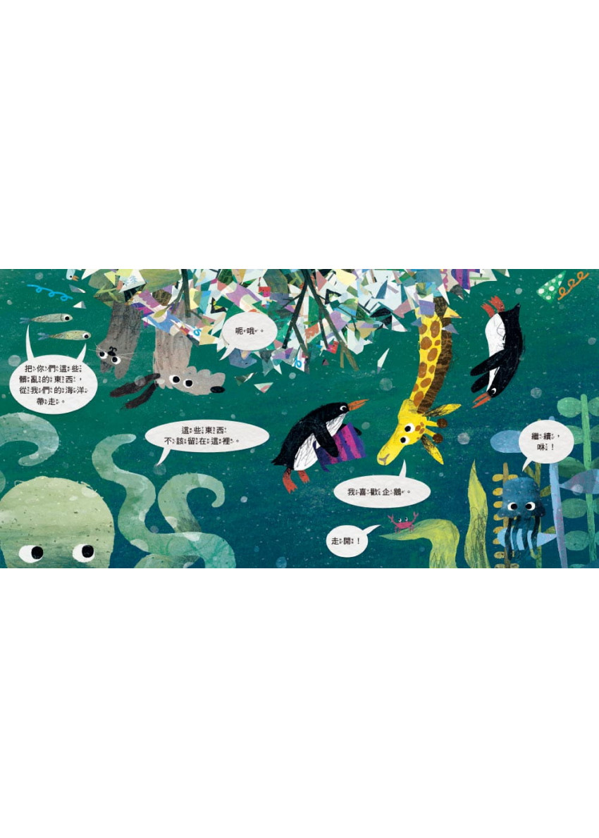 只見故事裡的小貓想盡各種(偷懶的)辦法,就是不願老老實實整理收拾,結果這團「垃圾山」就這樣被牠到處亂塞—作者利用頁面的分割特性,製造空間轉換的趣味感,當讀者翻開下一頁,竟然一下來到了森林,一下又來到了海裡,有別於一般「整理環境」的繪本,作者在畫面的安排上可說是充滿了創意,給予讀者十分不一樣的想像模式。