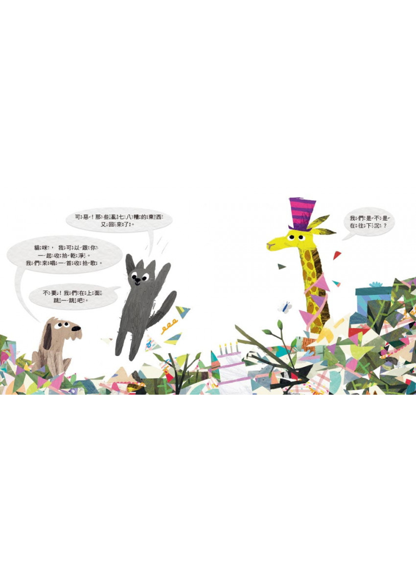 原來,把這一團混亂的「垃圾山」好好整理分類、收拾完畢後,出現的是一幅歡樂美好的派對場景!結果,下一頁大家在太高興的情況下,又把整頁畫面弄得一團混亂了⋯⋯這樣的安排真可說是充滿了趣味。