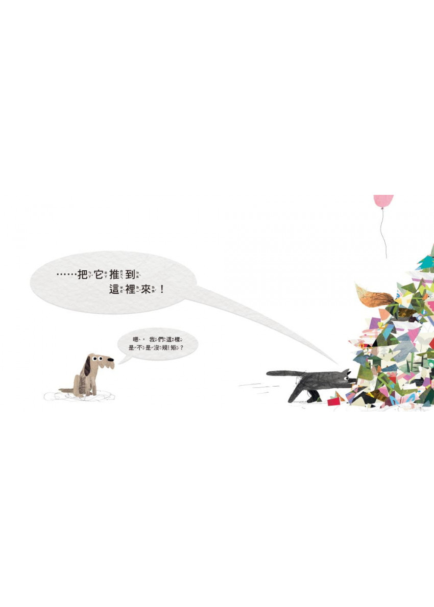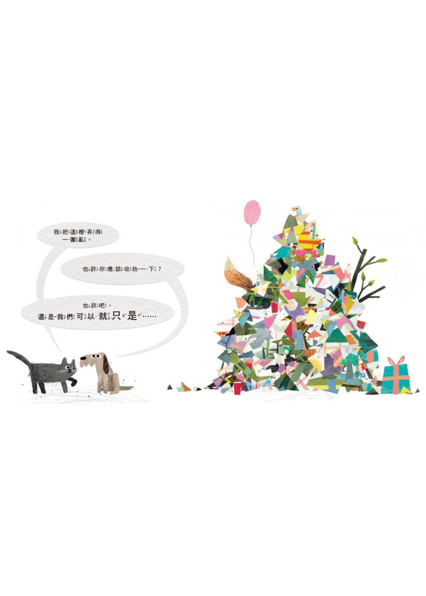 這是一個很有巧思的可愛故事,除了畫面一開頭那一大團花花綠綠不知名的「垃圾山」很是搶眼,小貓跟小狗的對話更是生動,令人腦中立即聯想到,這活脫脫是一個愛搗亂又偷懶不肯好好收拾的小毛孩,再搭配上一個在旁叨唸、理智線最終斷裂的家長的組合嘛!(笑)