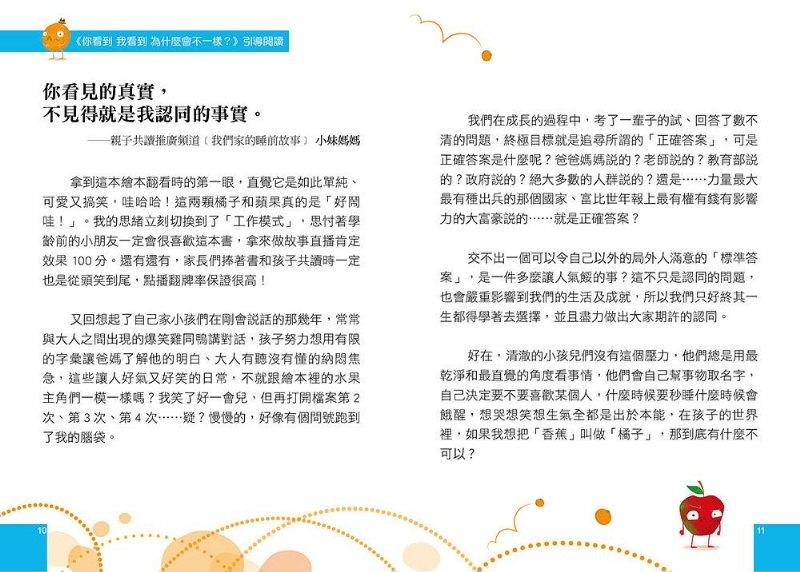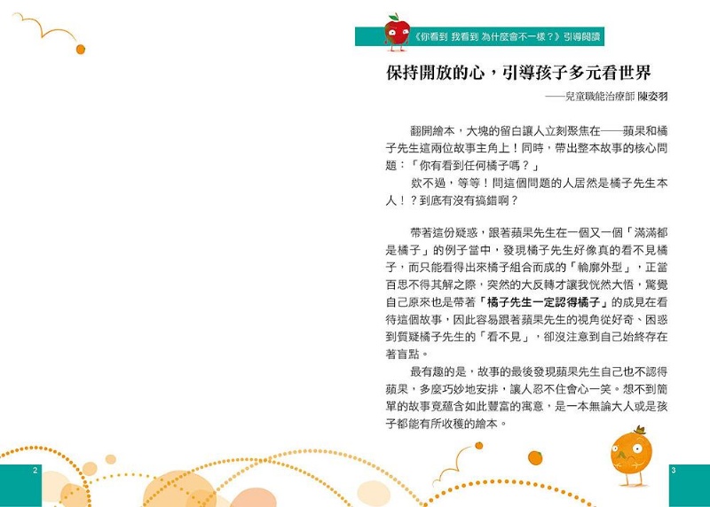 內容介紹: 【多元觀點/突破盲點】 O先生想要一個橘子,A先生好心地幫忙尋找── 但是,A先生找到的「橘子」, O先生都說:「那不是橘子!」 為什麼會這樣呢? 誰說的才是對的呢? ◆希望藉由本書引導孩子 ‧打破既定思考模式 ‧學習轉換觀點看事物 ‧訓練邏輯思維能力