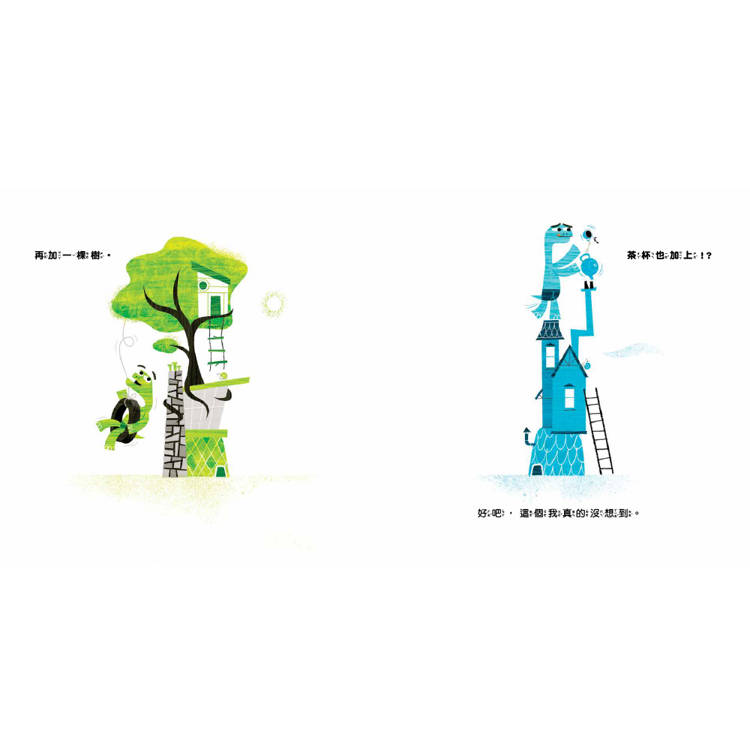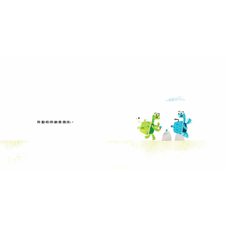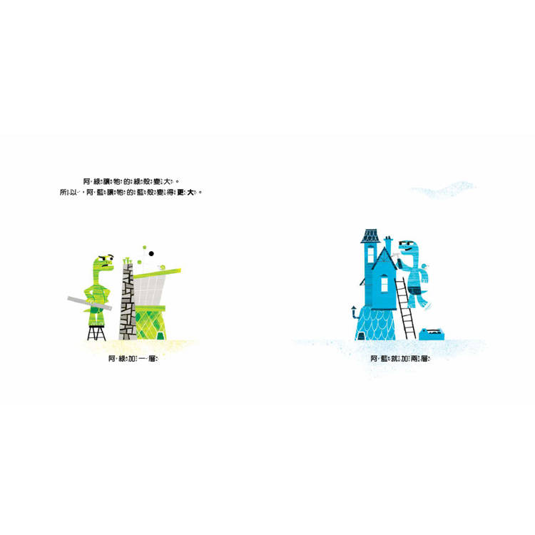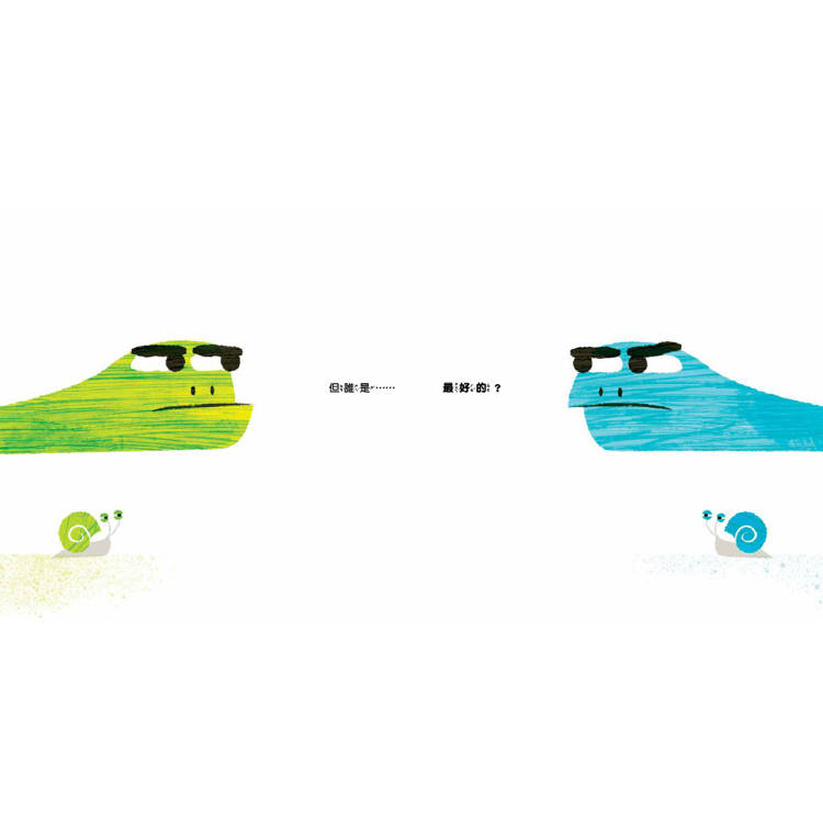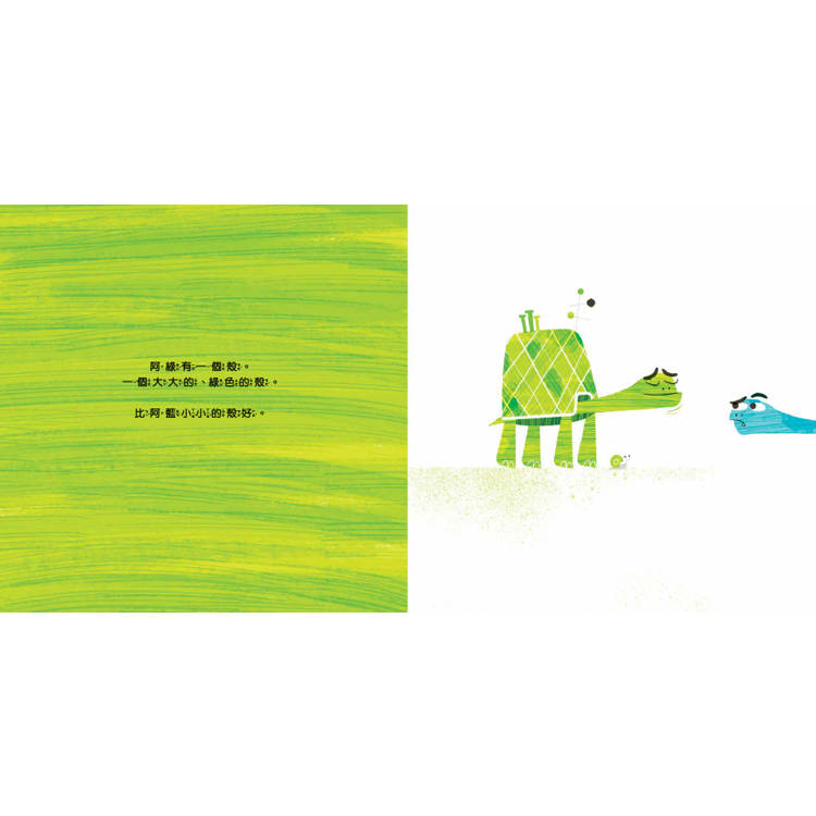 不相信?光看封面那兩隻烏龜生動的表情與姿態,便完美體現了「來比啊!比就比!」這個主旨──真的沒說錯,這兩隻烏龜在故事裡就是比較個沒完沒了,從一個小小的殼比到大大的殼,再從矮矮的殼比到高高的殼,再從地面一直比到外太空去……