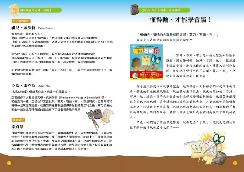 內容介紹: 讀繪本,培養孩子正向競爭觀念 懂得輸,才能學會贏! 【正向競爭】 我希望你已經準備好接受挑戰了! 你一定玩過這個遊戲。 現在來閱讀三大勇士的傳說吧! 看一看這場挑戰是由誰開始的── 剪刀、石頭、布! ★★ 古老的後院王國中, 有一位名叫「石頭」的戰士, 他是王國裡最強壯的人, 但他很失落,因為始終沒有人可以打敗他。 直到有一天, 他遇見了命運為他安排的另外兩位對手──