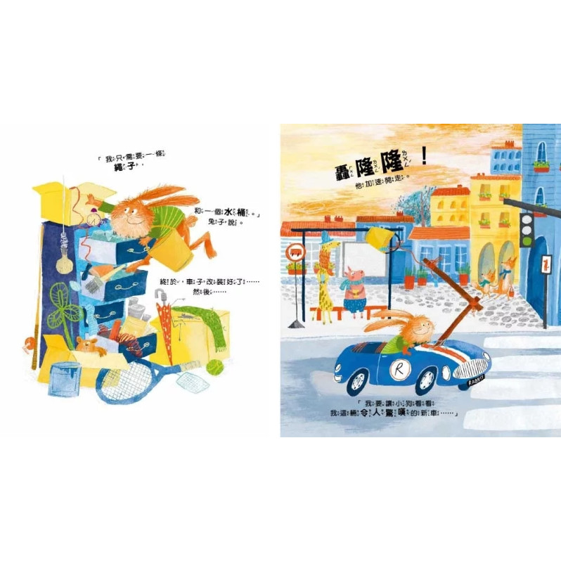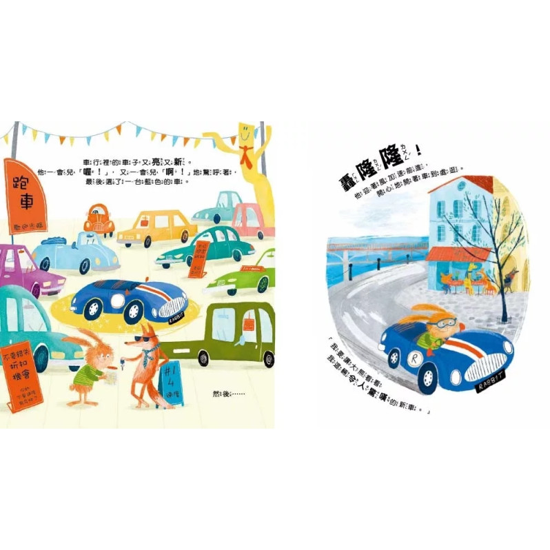 直到他開過高速公路,聽見所有動物朋友呼喊他的名字,請他一起幫忙解救困在橋上的小貓。兔子堅定地回絕了,因為他必須繼續趕路,和其他朋友展示自己的新車。但下一刻,兔子隨即因為自己自私的決定感到有點過意不去,而一回頭,他發現根本沒有朋友在看他的車子呀!