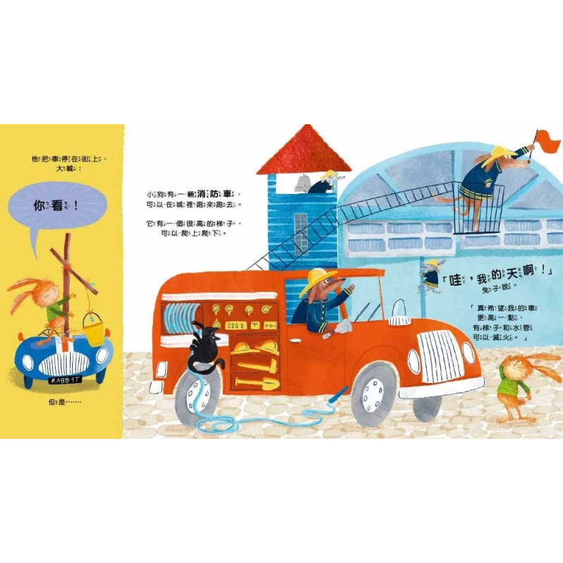 開著2.0版本新車的兔子接著去找小狗,沒想到看見小狗竟然開著具有梯子和灑水器的消防車,這些配備又讓兔子心動了。於是他再次為車子設計梯子和灑水器,現在新車成了3.0版本,而兔子的下一站是找到鴨子……