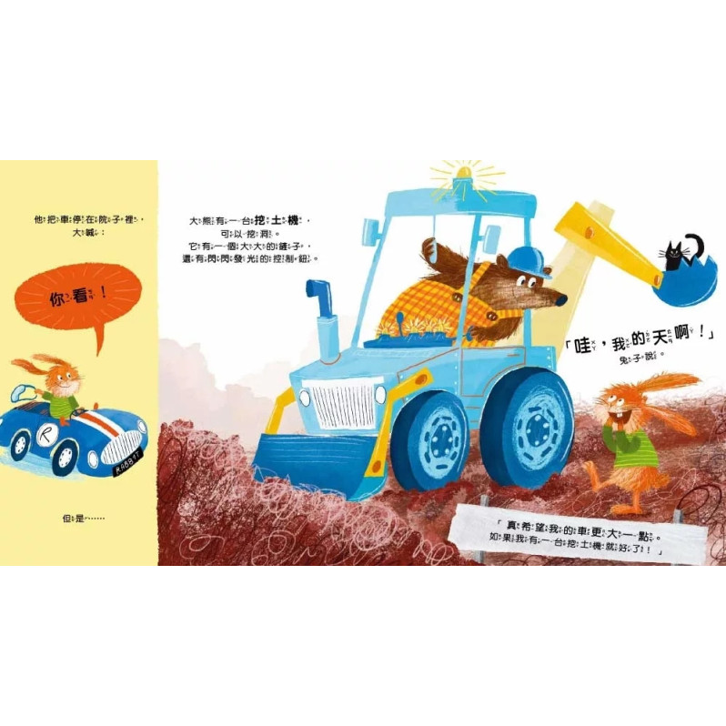 故事裡的兔子一直渴望擁有一台新車,他存了好久的錢,好不容易等到了買新車的這一天。當他拉風上路後,他第一個想到要把車子秀給大熊看,卻發現大熊開著一台挖土機!兔子也想要有挖土機的裝置,於是他翻箱倒櫃,找到了能模擬挖土機的工具。