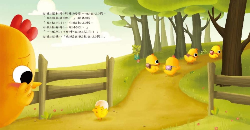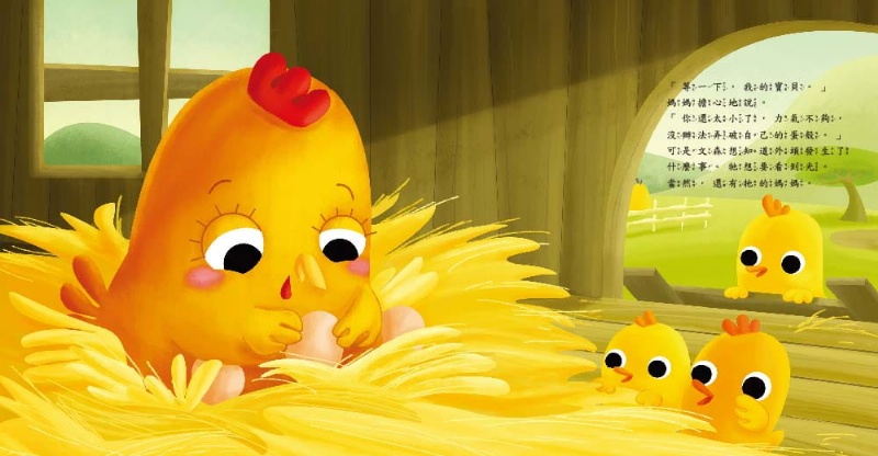 真是家家都有個沒耐心的小孩啊~而我們故事裡的文森,則可說是史上最沒耐心的小雞寶寶了,竟然心急到自己打破蛋殼蹦出來,而且還企圖叫醒其他的弟妹早點出生!說到這,不得不說書中的小雞媽媽是一個很正面的示範,面對這猴急孩子如此的表現,竟然還是捺著性子給予極大的包容和溫柔。我想,這是在探討如何讓孩子培養「等一下」的耐心及相關的安全教育之前,閱讀此書的爸媽第一個應該關注的點──小雞媽媽絕佳的情緒管控技巧著實令人佩服。現實生活中,面對這樣胡亂搗蛋的孩子,應該是會讓許多爸媽都忍不住爆青筋怒吼吧。