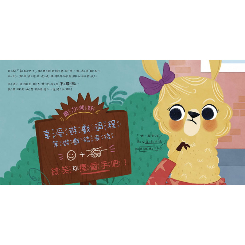 透過這樣的情節,我們可以在閱讀中試著引導孩子,對「輸贏」這件事有同理心,進而去理解從事任何遊戲或活動的真正意義,逐步培養孩子有「運動家的精神」,在面對輸的時候,能調整情緒,坦然接受,並表現出風度來;贏得勝利的時候,也不要過於得意洋洋,養成謙虛的態度。