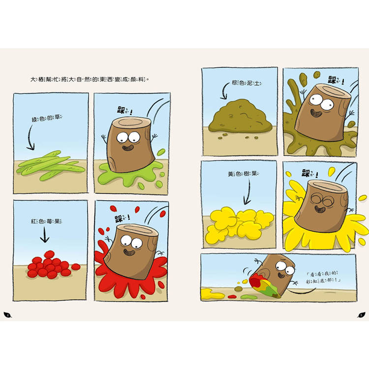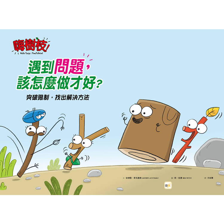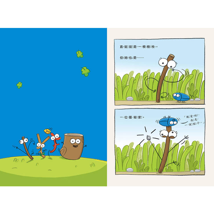 沒錯,《嗨樹枝!》系列故事便是以四枝個性迥異的小樹枝為主角,內容風格除了延續前作鴿五郎的朝氣與活力之外,這次改採全彩內頁的繪本型態,讓整體畫面更加繽紛活潑。