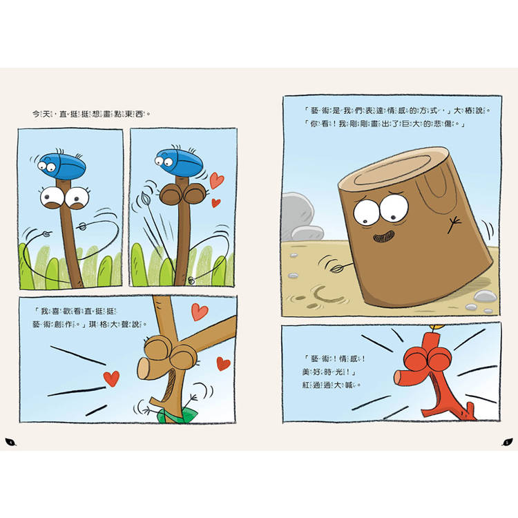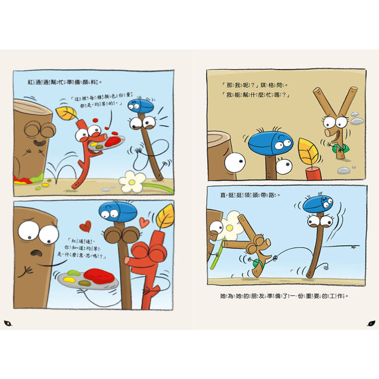 如果有看過《垃圾桶偵探鴿五郎》這個系列的讀者,一定對裡頭的小樹枝寵物──「川川」不陌生,這次鴿五郎的作繪者在新系列中,再次創造出四個全新的樹枝角色:紅通通、大樁、直挺挺、琪格,跟川川最大不一樣的是,他們不只是可愛的小樹枝,還是會說話、活跳跳的小樹枝團體!