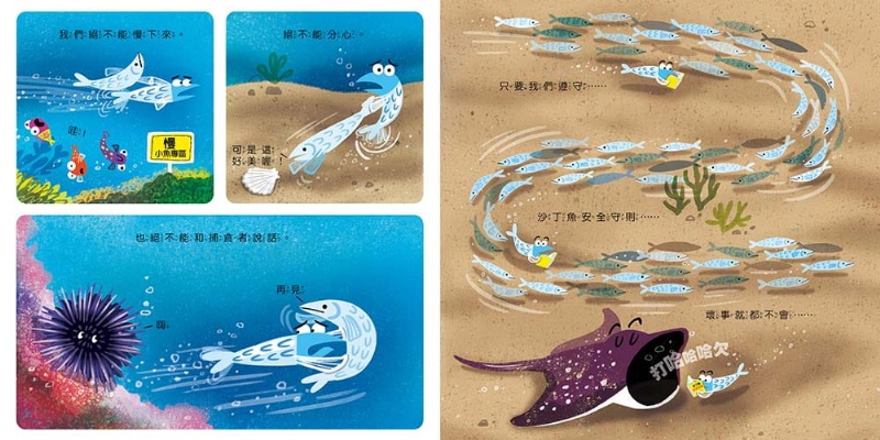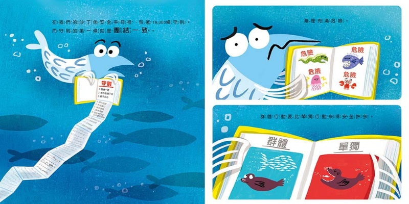 其中有隻沙丁魚很專心的閱讀著「沙丁魚安全手冊」。