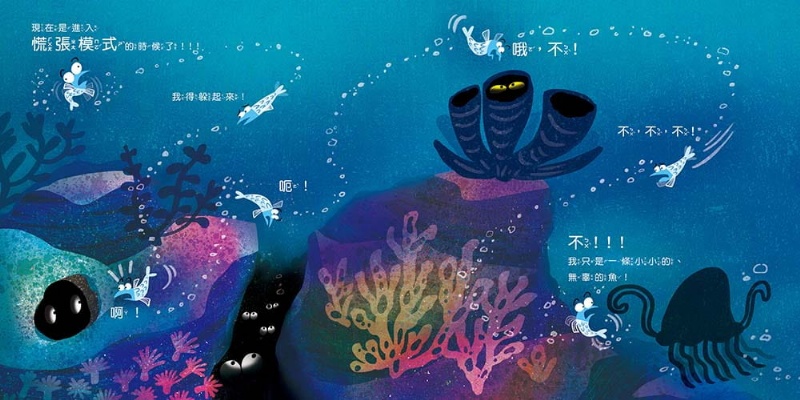 我們這個故事裡的主角小沙丁魚,就如同書名描述的,面對未知的陌生環境,總是「很緊張很緊張」,也總會想像出許多未知的恐懼,一有什麼風吹草動就把自己嚇個半死……直到有一天,他遇見了水母,從他身上學習到了如何化解焦慮的好法子,才漸漸感到放鬆,開始能愉快自在地在海底世界生活了。