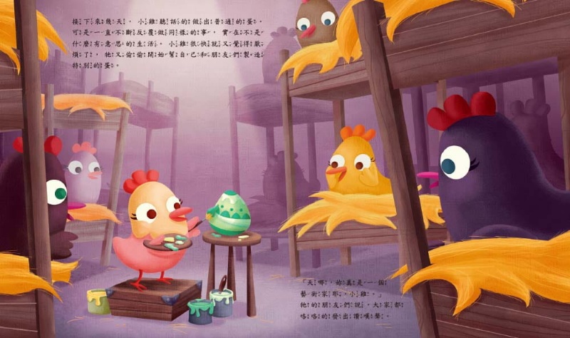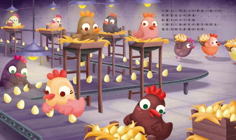 故事裡的小雞,在製造白色雞蛋的工廠工作,但牠卻不像其他小雞一樣,牠認為「雞蛋都是白色的好無聊」,進而開始創創造出不一樣的蛋。
