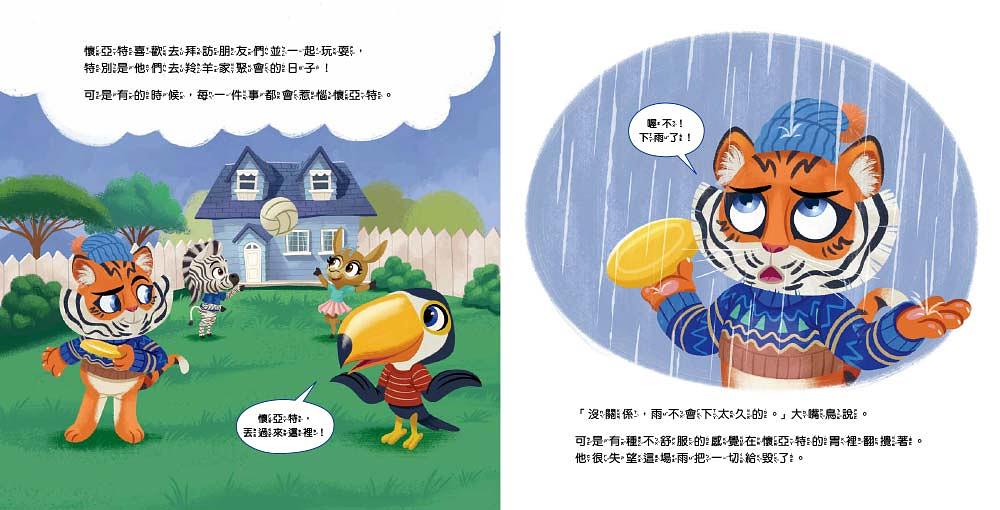 內容介紹: 老虎懷亞特很高興 能和他的朋友們一起玩耍, 但是一場雨阻礙了他們的戶外活動, 他感覺很失望, 接著一切都開始不對勁了── 之後,懷亞特又輸掉了一場比賽, 他抗議不公平,卻換來朋友的指責, 這讓他變得更加沮喪; 雖然懷亞特試著忍耐,但在進行下一個遊戲時, 他還是忍不住發了脾氣…… 懷亞特能否試著學會 如何冷靜下來, 並控制自己的情緒?