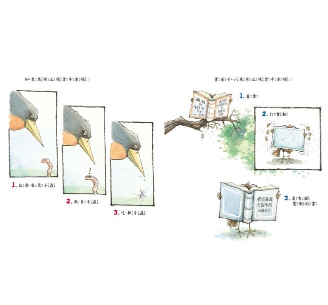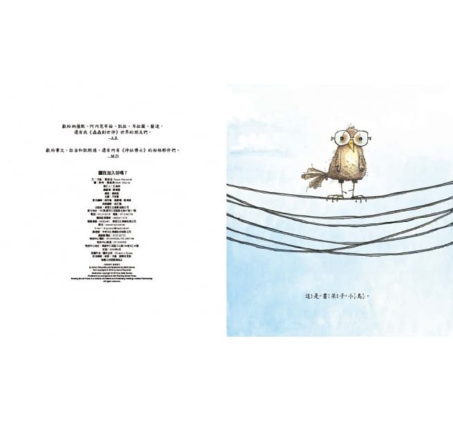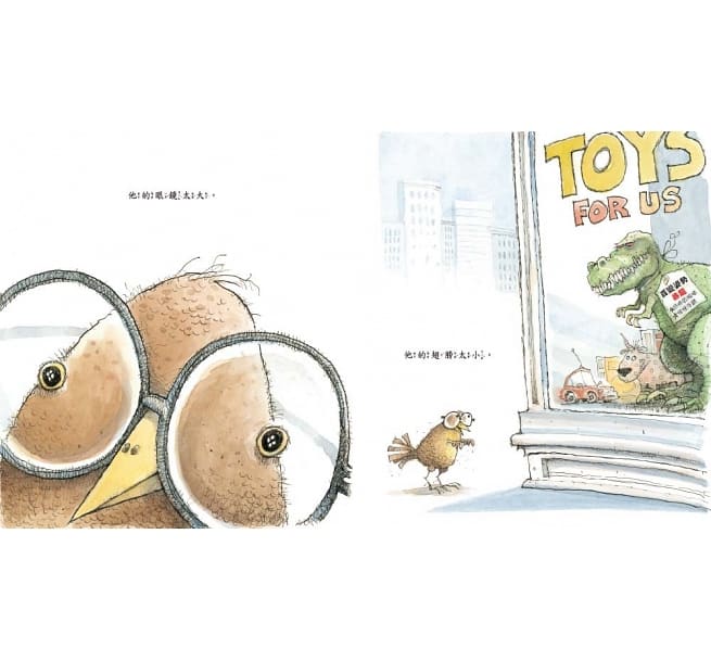 故事的主角,如封面圖所呈現的,就是一隻看起來不折不扣的「書呆子小鳥」,戴著特大眼鏡的呆萌模樣,看起來實在很逗趣。但是,看完故事,卻會發現──其實他並不呆!而是一隻很有自己想法、內心善良溫暖且有智慧的小鳥呢!