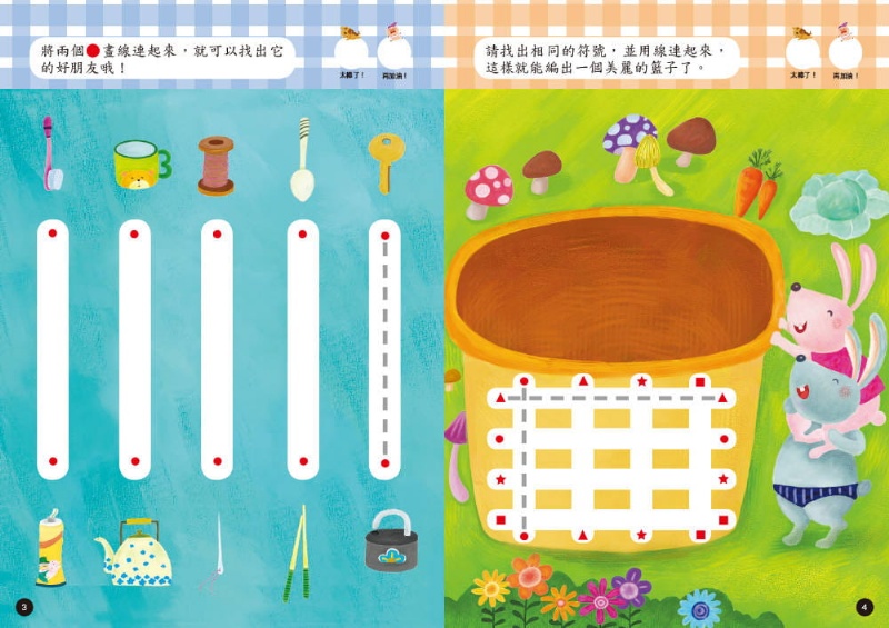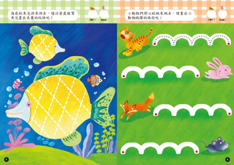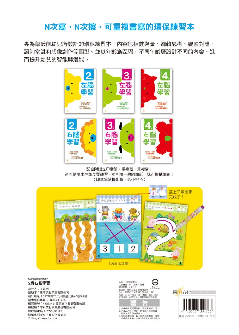 另,本書內頁設計為「可重複擦寫」之N次寫材質,搭配可﹝手寫畫線﹞之彩色筆,可讓孩子藉由「反覆練習」的過程,自然而然地增進各項能力,筆上附贈的印章還可用來﹝蓋章答題或獎勵﹞,更增加學習樂趣。