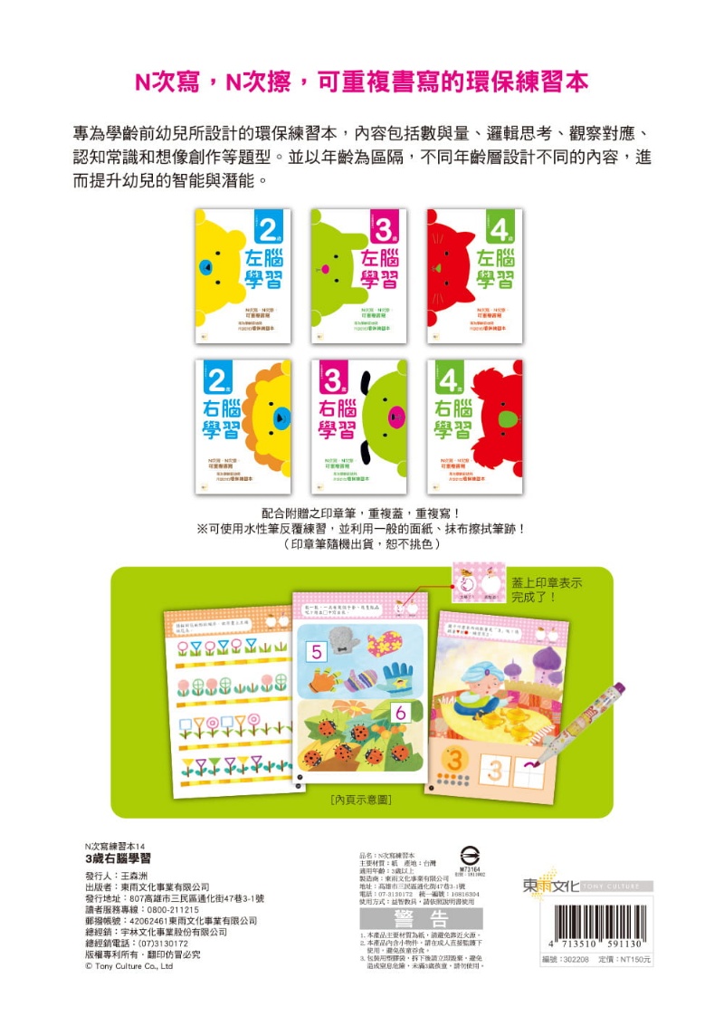 另,本書內頁設計為「可重複擦寫」之N次寫材質,搭配可﹝手寫畫線﹞之彩色筆,可讓孩子藉由「反覆練習」的過程,自然而然地增進各項能力,筆上附贈的印章還可用來﹝蓋章答題或獎勵﹞,更增加學習樂趣。