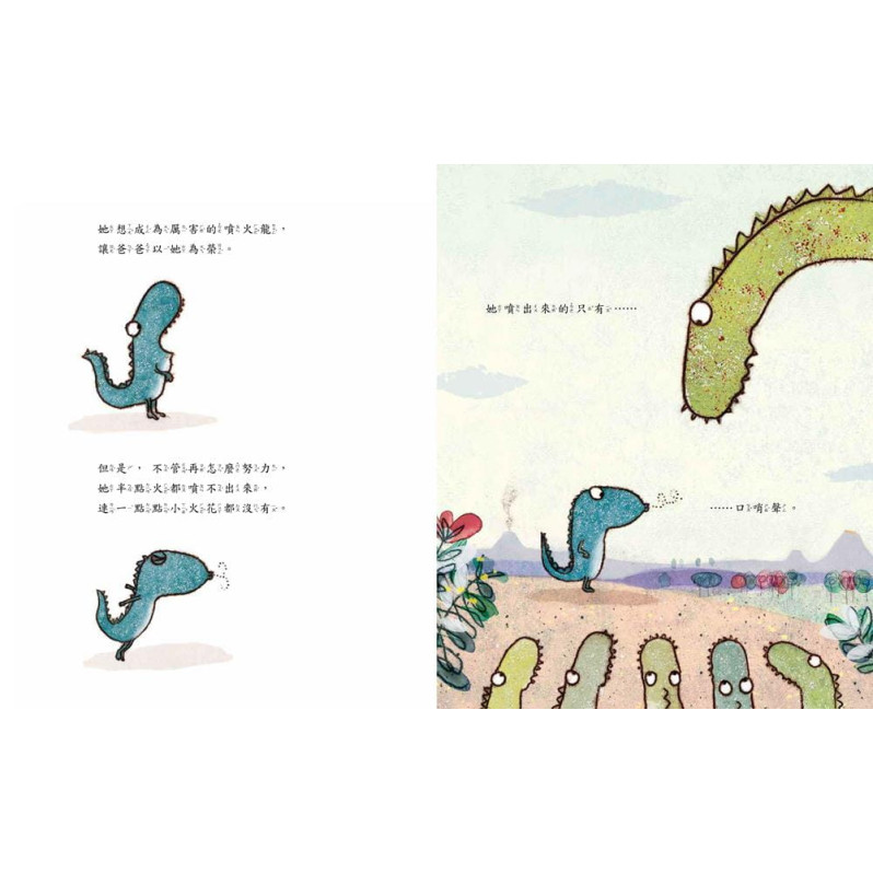 ▸▸「愛有沒有條件?」、「和別人一樣等於優秀嗎?」、「如何發掘潛藏的才能?」《小火龍,不噴火》用可愛的畫風、逗趣的敘事、驚喜的轉折與甜蜜的結尾,讓大人與小孩更認識自己與彼此,化解「不如別人」的焦慮,發現意想不到的才華,理解「適得其所」是最好的狀態,並更加靠近愛的真諦。