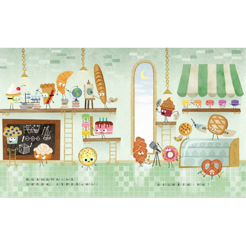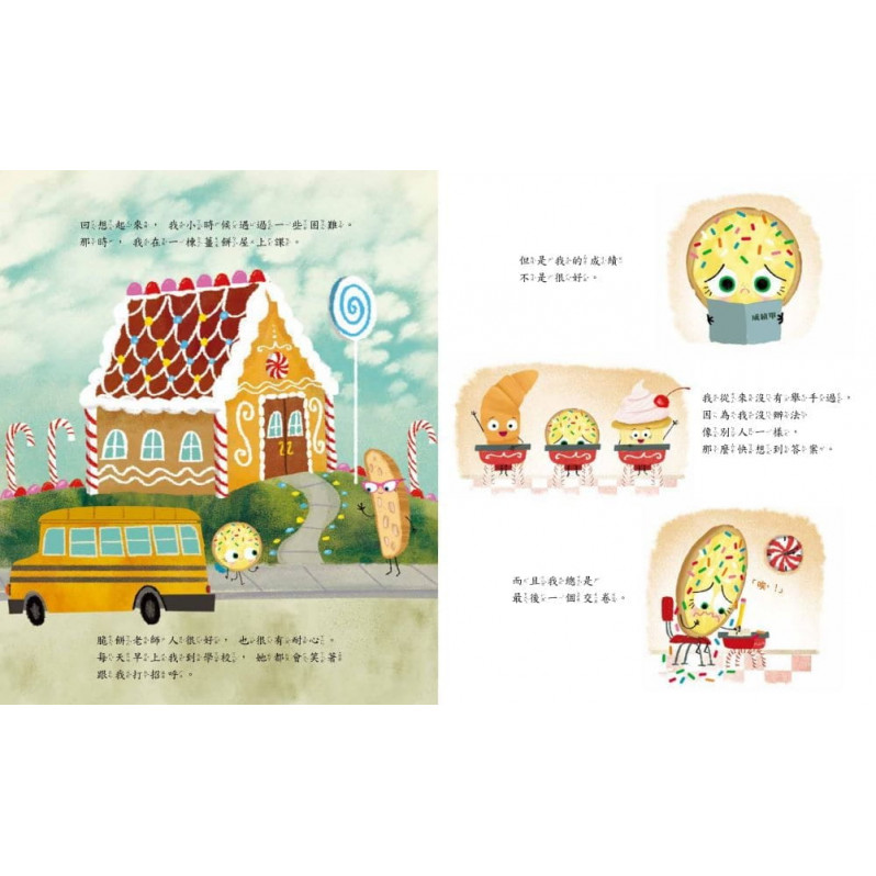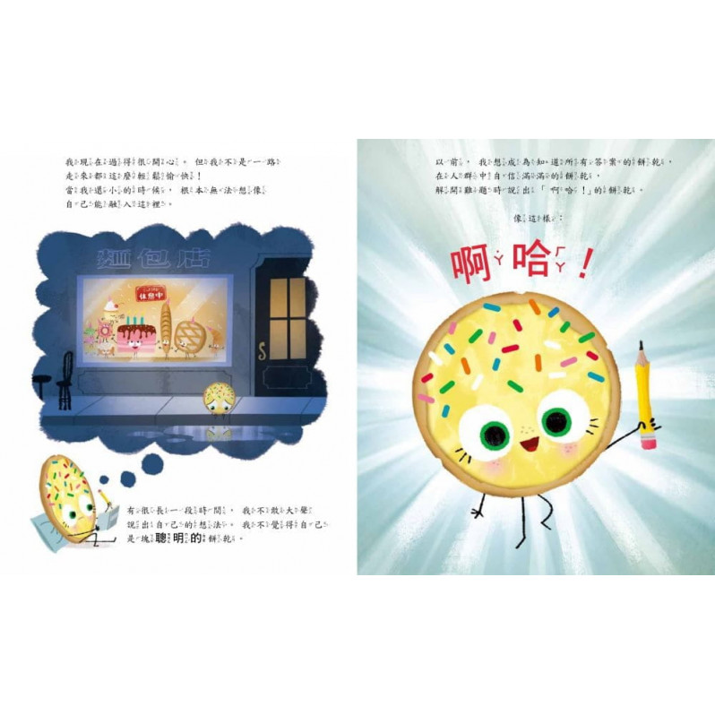 甜點街的街角有間麵包店,好多點心、蛋糕、蛋捲、小麵包都住在這裡,還有開心的小餅乾。但是,她不是一開始就這麼順遂,回憶起在薑餅學校求學的時光,她不敢舉手回答問題、不管多認真K書,總是最後一個交卷,對自己很沒自信。一天,老師要大家交出百分百「原創」的作品。小餅乾嘗試烘焙、做木工、雕塑,通通都失敗。突然想到,寫詩好了!完成詩作『我的心碎日記』。朗讀出來時,同學們的反應會是如何呢?小餅乾能找到屬於自己的「聰明」嗎?