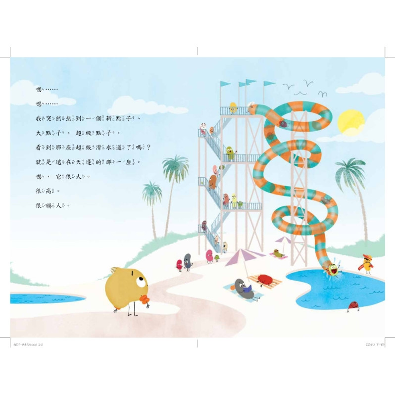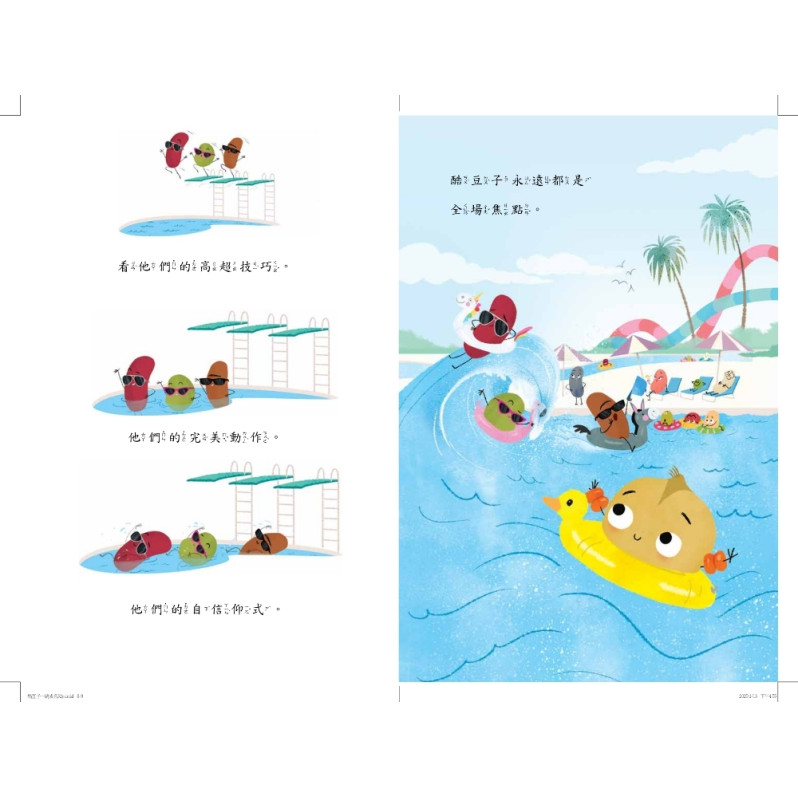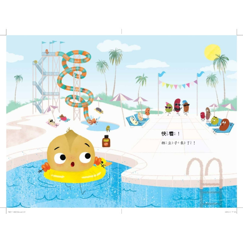 夏天來臨,酷豆子們到泳池戲水,展現了令人驚艷的游泳技巧。然而,泳池的淺水區卻是主角唯一感到安心的地方。儘管他試著做些酷動作來吸引大家注意,卻總是失敗、出糗。直到他看見那座很高很高的滑水道,決定挑戰自我,他告訴自己:「只要征服超級滑水道,他也能像酷豆子們一樣酷。」然而,當他爬到頂端時,卻開始忍不住顫抖,究竟他能不能成功克服恐懼,勇敢溜下去呢?