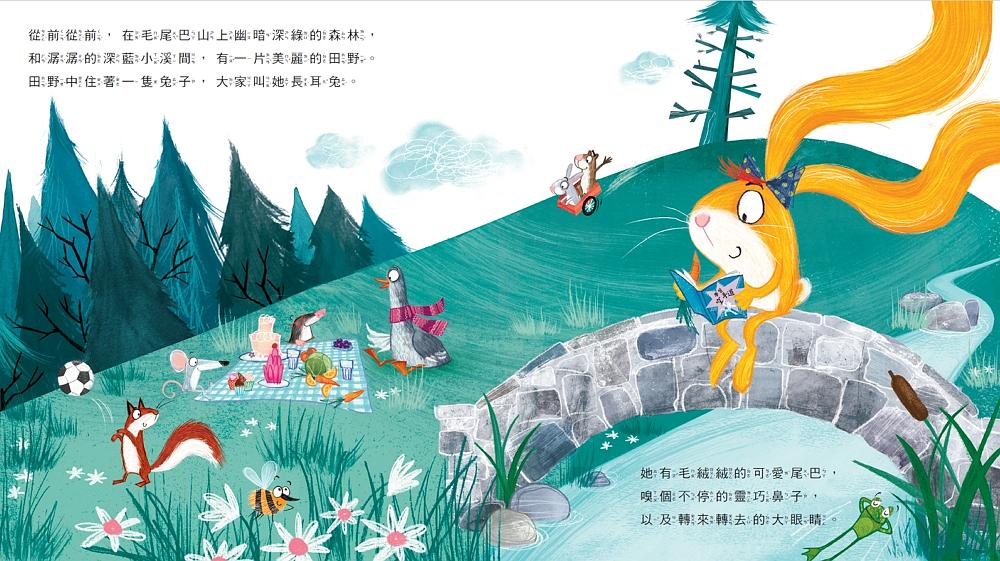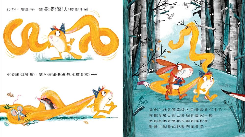 長耳兔和其他兔子一樣,有著毛茸茸的可愛尾巴、水汪汪的大眼睛,以及一對長耳朵——等等,實在太長了!這讓長耳兔不管走到哪,耳朵總是拖在地上,或被樹枝勾到。因為她的長耳朵太顯眼,兔媽媽不禁擔心潛伏在森林中、虎視眈眈的獵食者會把她一口吃掉,於是決定讓長耳兔住在高聳入天的樹洞裡,遠離一切危險。