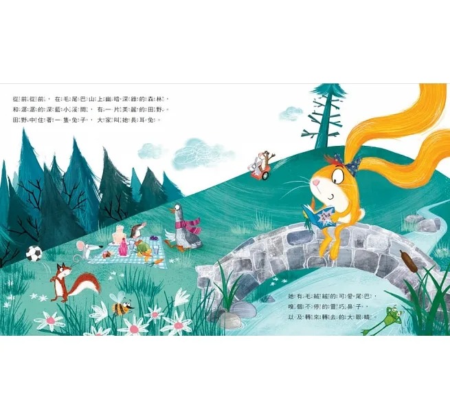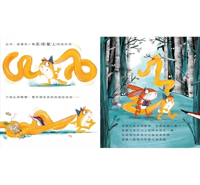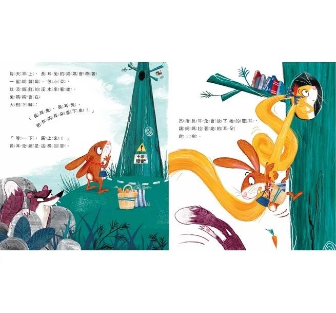 長耳兔和其他兔子一樣,有著毛茸茸的可愛尾巴、水汪汪的大眼睛,以及一對長耳朵——等等,實在太長了!這讓長耳兔不管走到哪,耳朵總是拖在地上,或被樹枝勾到。因為她的長耳朵太顯眼,兔媽媽不禁擔心潛伏在森林中、虎視眈眈的獵食者會把她一口吃掉,於是決定讓長耳兔住在高聳入天的樹洞裡,遠離一切危險。