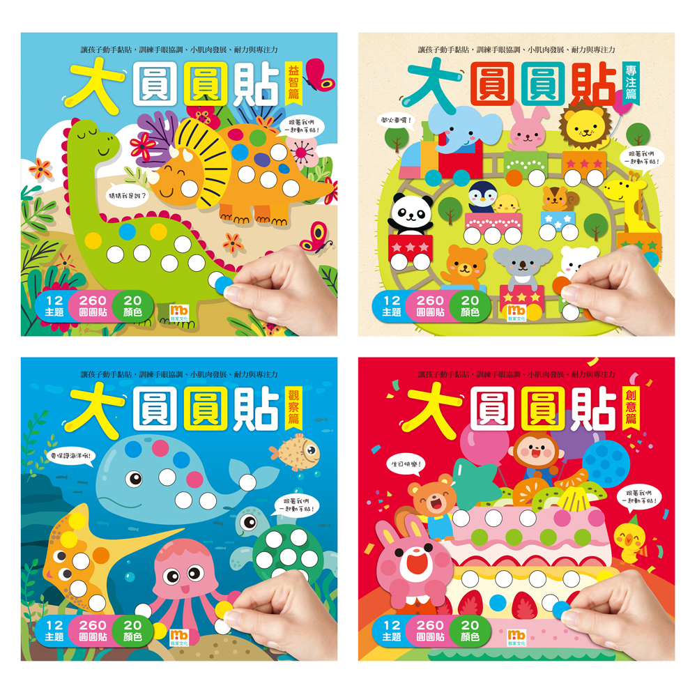 內容介紹: ★全系列共4冊 ★共有48個主題、1040張大圓型貼紙 ★邏輯+圖像+觀察+貼紙 ★訓練手眼協調,促進小肌肉發展 ★貼出色彩美感和創造力 ★OPP袋裝 (整包出售) 尺寸26×25.5cm / 每本16頁 / 4本合售