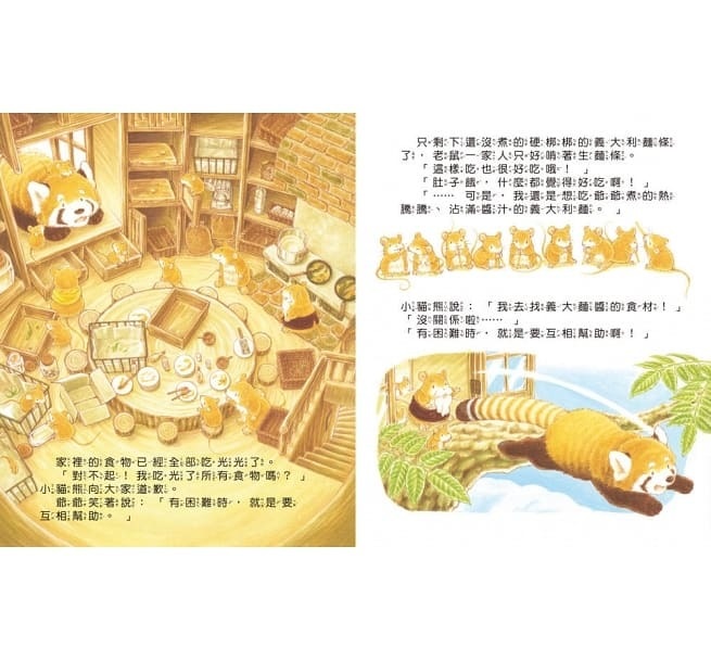 老鼠一家人最愛吃爺爺煮的義大利麵店,結果吃到一半……「咕嚕咕嚕~」突然有隻非常飢餓的小貓熊跑了出來,後來他們彼此互相幫忙,還越過山林冒險,沿途遇到很多小動物,還發生了很多特別的事情!